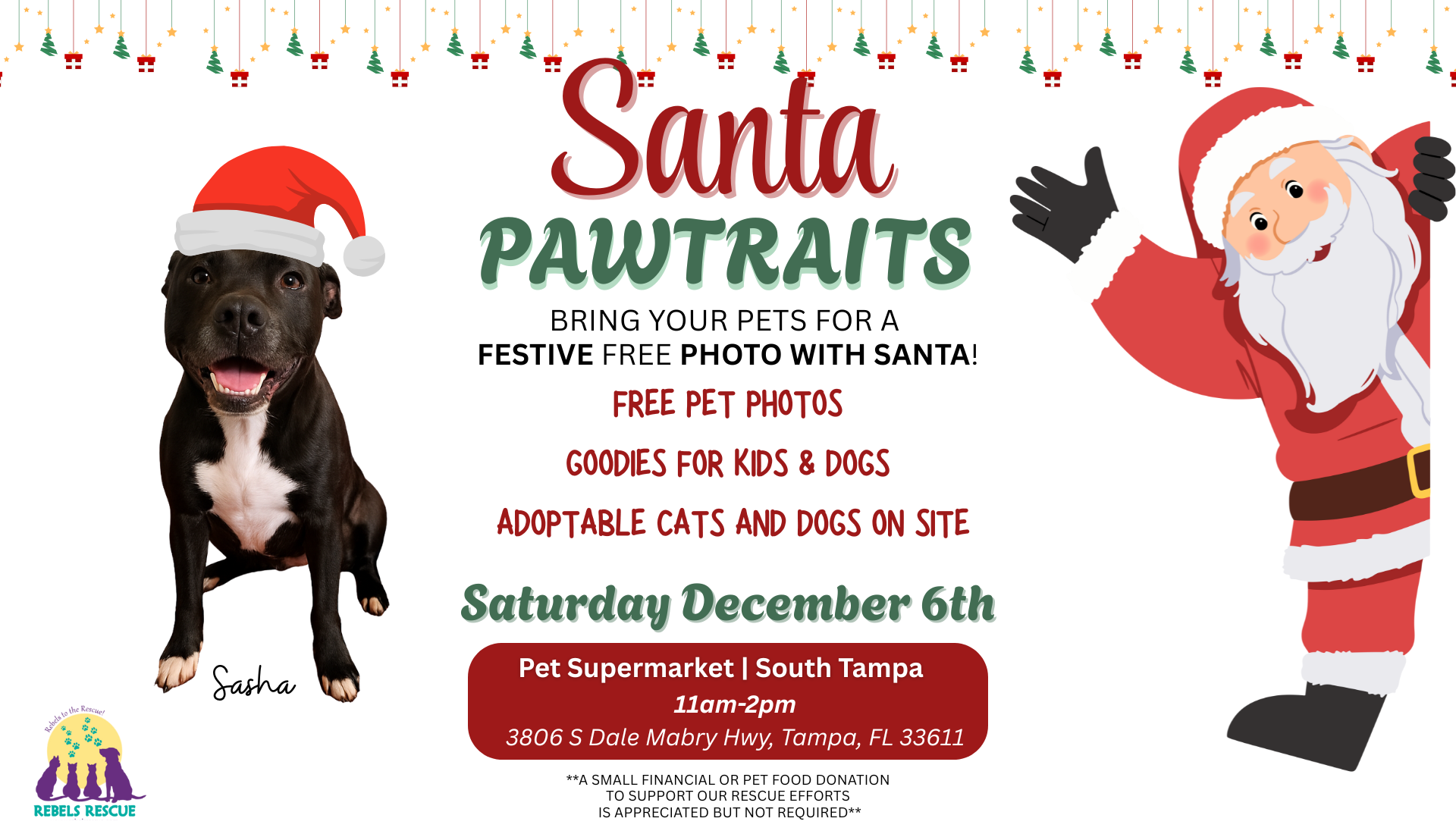 You can follow this event on our Facebook page. For more details about our Santa Pawtraits, check out the Facebook Event Page and don't forget to RSVP! Santa Pawtraits & Holiday Magic - Pet Supermarket Saturday December 6th, 2025 11:00 AM until 02:00 PM Location: Pet Supermarket Map: 3806 S Dale Mabry Hwy Tampa FL 33611 See all of the animals attending this event. Get ready for a day full of holiday cheer, wagging tails, and festive fun! Rebels Rescue is hosting a special “Santa Pawtraits” photo op for your pets to meet the jolly man himself and snap that perfect holiday picture.